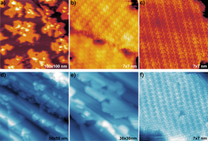 Figure 04. STM images of VS₂ monolayer islands on two different graphene-covered substrates. The first row corresponds to VS₂ on gr/Ir(111): a) overview of the sample, while b) and c) are atomically resolved images, also revealing the charge density wave (CDW) periodicity. The second row shows VS₂ on stepped gr/Ir(332): d) and e) are large-scale images showing the distribution of the islands across the step edges, and f) is an atomically resolved image also displaying the CDW periodicity.